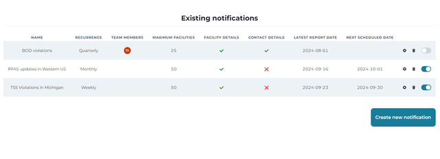 Would you like to get a status report every week on the most recent BOD effluent violations in the US Midwest? Set up a notification based on your wastewater facilities of interest (industry, location, size, discharge patterns) and specify how often you want to get a report.