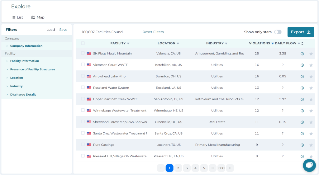 Use our advanced filtering to find wastewater facilities by location, industry, compounds discharged, permit details and much more